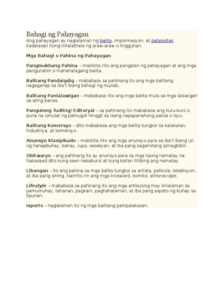 Bahagi Ng Pahayagan At Kahulugan Halimbawa