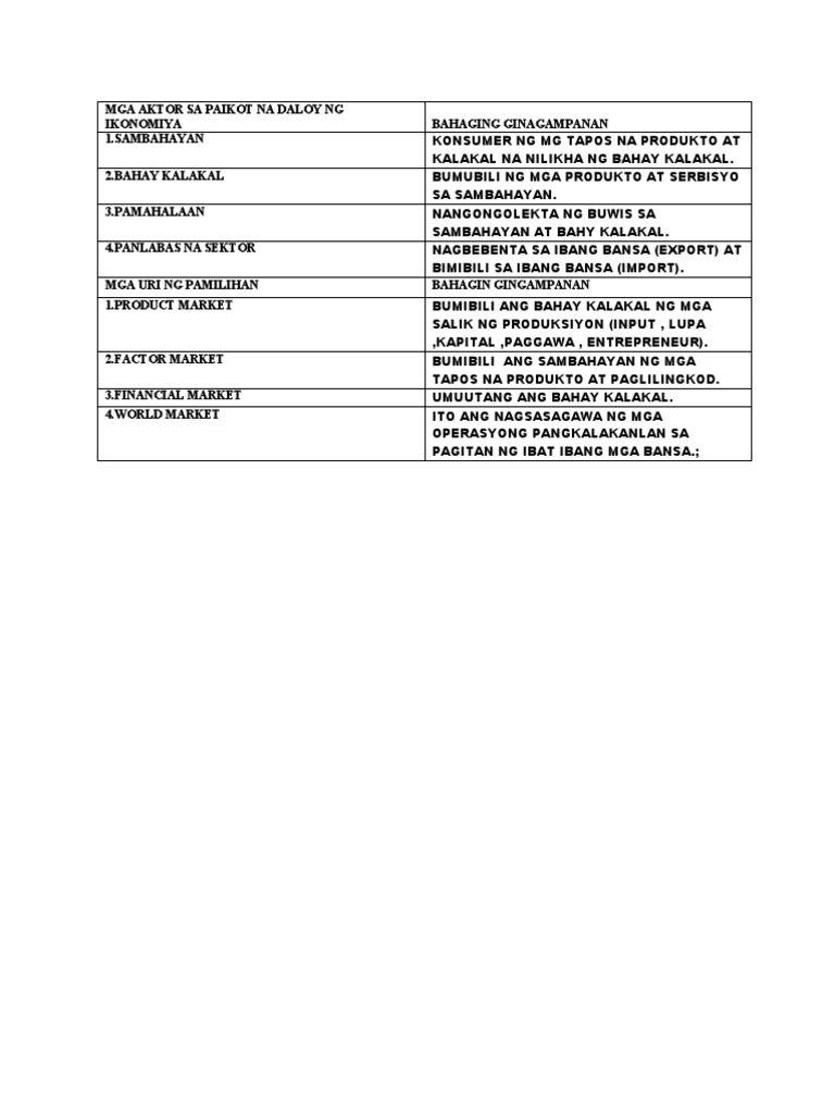 Mag-isip ng limang bagay o anoman na pumapasok sa isip mo kapag binabasa. Mga Aktor sa Paikot na Daloy ng Ekonomiya. Ano ang ginagampanan ng financial market sa ekonomiya.